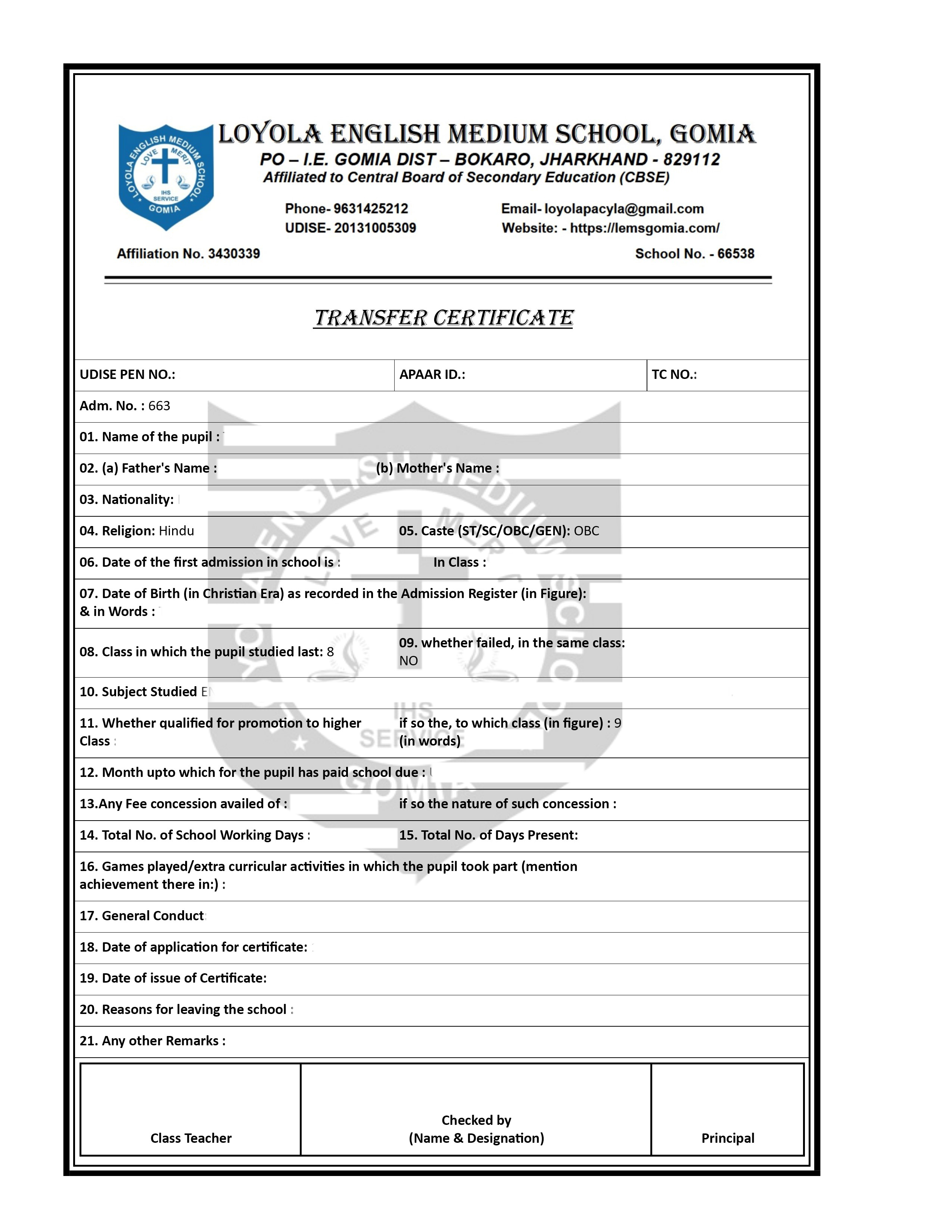 LOYOLA ENGLISH MEDIUM SCHOOL, GOMIA