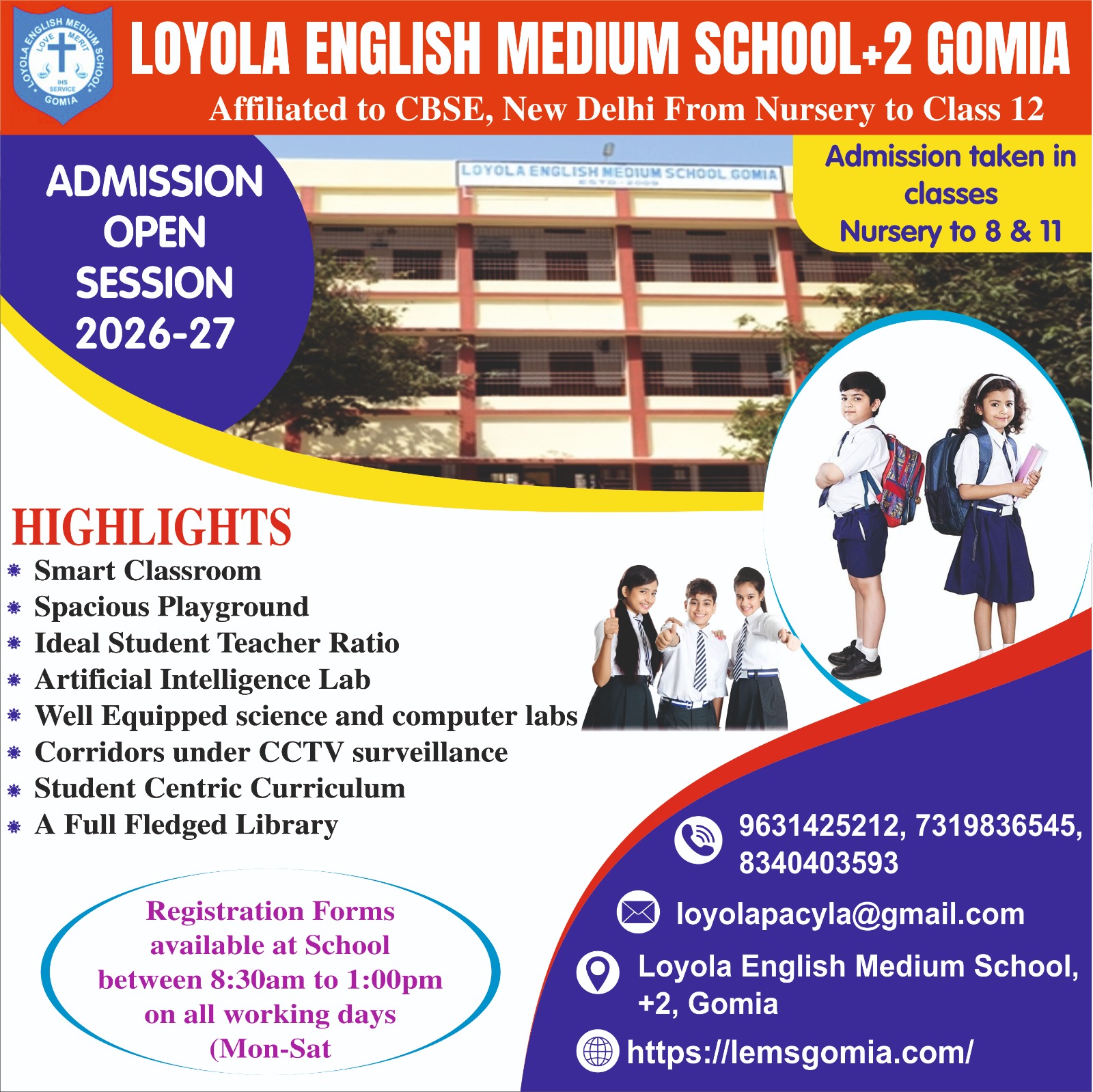 Admissions Open for 2026–2027 Loyola English Medium School (+2), Gomia, invites applications for new admissions in: Play Group, L.K.G., U.K.G., Classes I–V, VII, VIII, and XI. Enroll now! Apply Now ||